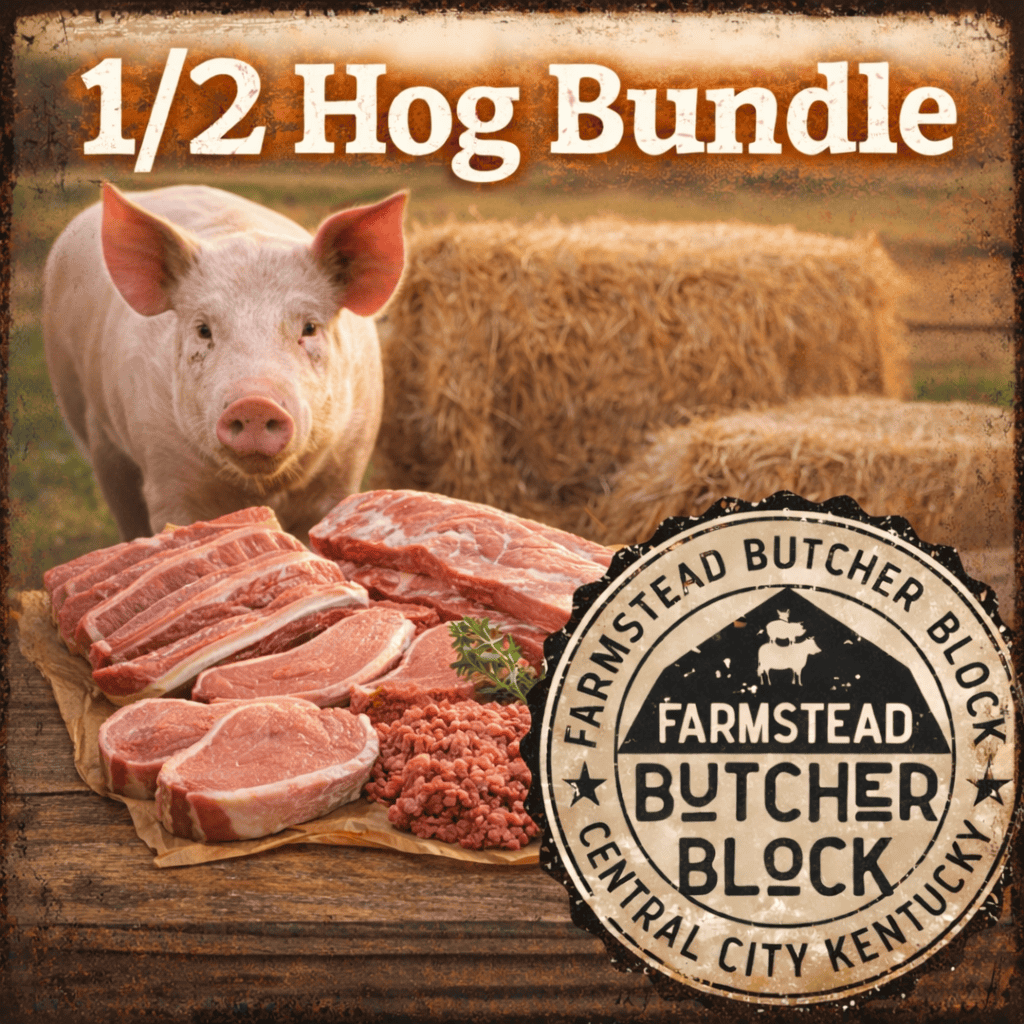 Fill your freezer with locally sourced Kentucky Proud pork. Farmstead half hog bundles are a great way to stock up with roasts, grill cuts, chops, sausage and bacon. Processed here in our USDA inspected facility, all products are vacuum sealed or vacuum packed fresh and flash frozen to stay fresh. Includes our house smoked, thick sliced bacon and your choice of 25 pounds of house made ground sausage. If you wish to purchase with SNAP or EBT, contact us and we’ll take your order. We cannot process those forms of payment online. Select your choice of sausage varieties below.