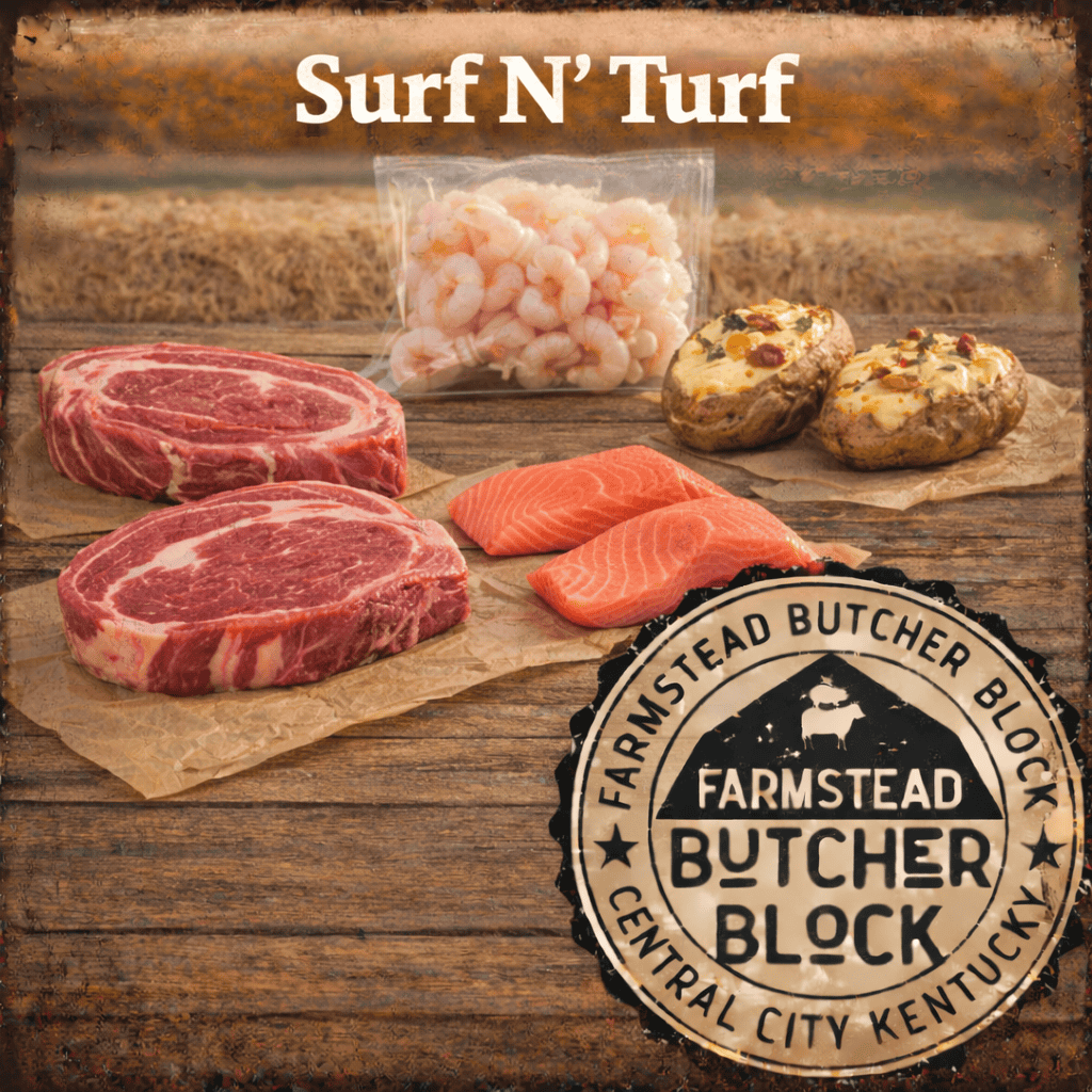 2 Boneless Ribeye 2 salmon filet 1 bag of frozen shrimp 2 twice baked potatoes